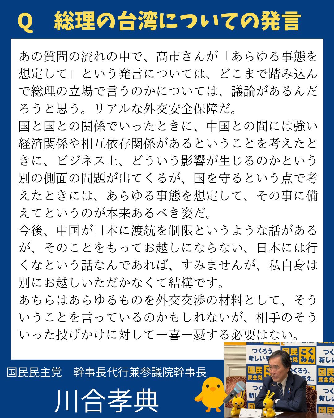 | … | 29無題Name名無し 25/11/19(水)15:26:18 IP:153.195.*(ocn.ne.jp)No.4384654+説明も何も、台湾有事は存立危機事態になり得るって、どっちつかずな曖昧な話をしているだけだしな。 |