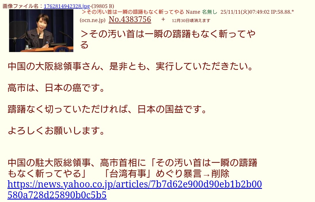 | … | 2無題Name名無し 25/11/19(水)12:51:51 IP:153.174.*(ocn.ne.jp)No.4384630そうだねx2共同通信のアンケートは集団自衛権の話でしょ |