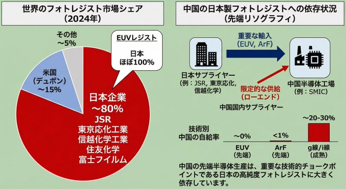 半導体の製造に必要不可欠なフォトレジストは、日本の東京応化・JSR・信越化学で80%を独占していて、中国の半導体メーカーのSMICも日本から買っている。