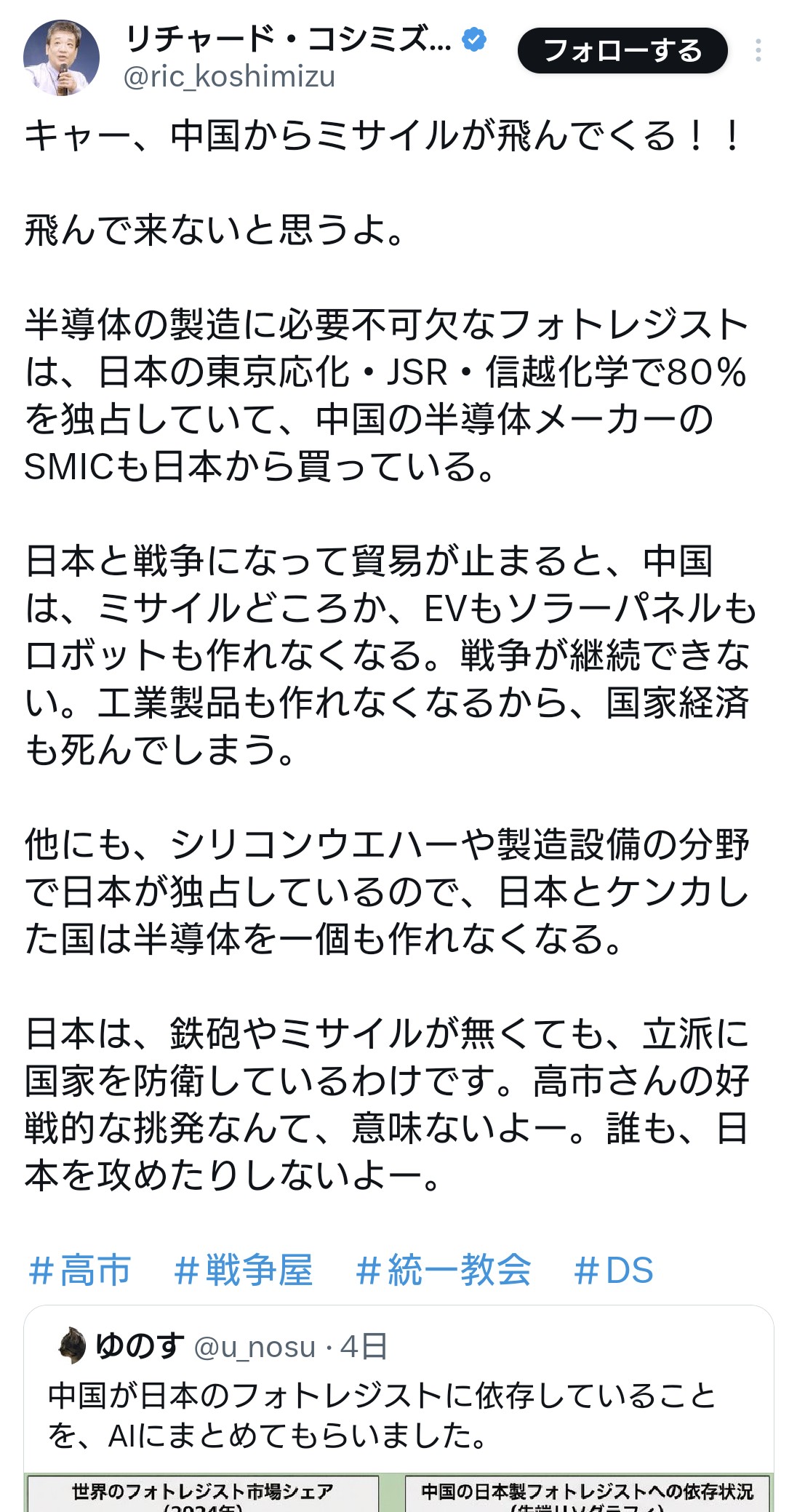 | … | 12無題Name名無し 25/11/26(水)22:55:31 IP:106.130.*(au-net.ne.jp)No.4385507そうだねx2>日本と戦争になって貿易が止まると、中国は、ミサイルどころか、EVもソラーパネルもロボットも作れなくなる。 |