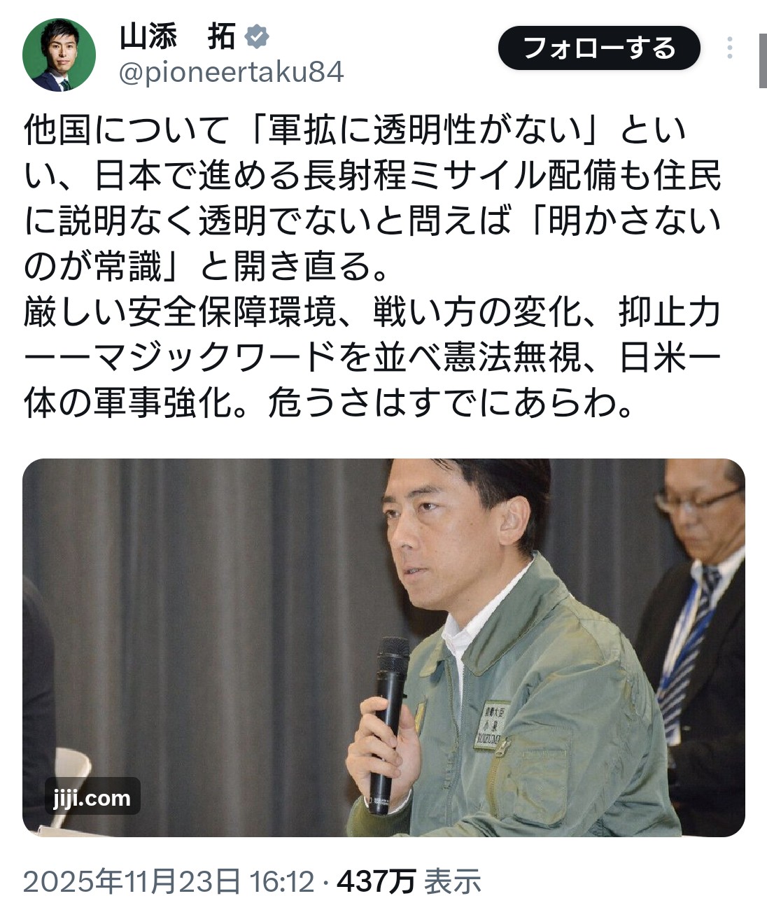 | … | 9無題Name名無し 25/11/26(水)21:20:19 IP:114.155.*(ocn.ne.jp)No.4385488そうだねx1中国本土どころか台湾にすら届かない対空ミサイルにどうのこうの言ってる時点で… |