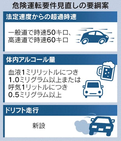 法制審議会(法相の諮問機関)の部会は12月25日、危険運転致死傷罪の適用要件を見直し、新たに数値基準を導入する要綱案をまとめた。