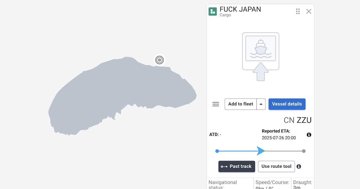 船が発する位置情報などの信号を受信し地図上で示すウェブサイト「マリントラフィック」で、日本を侮辱する名前の船が、尖閣諸島・魚釣島付近に表示されていることがわかりました。