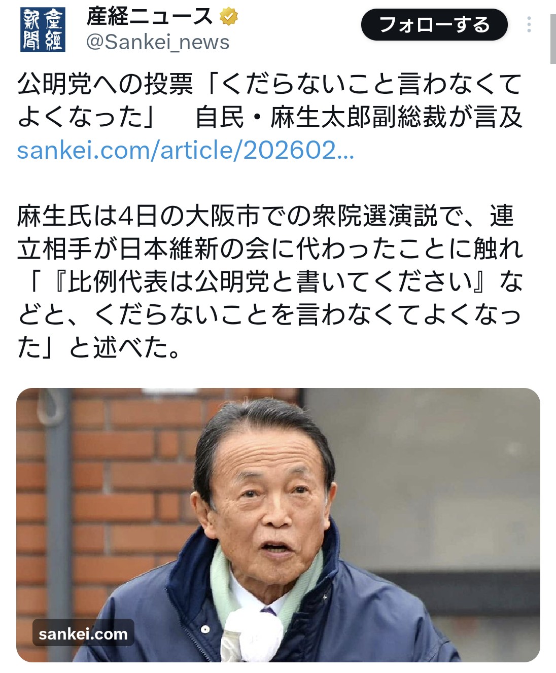 | … | 18無題Name名無し 26/02/09(月)19:04:10 IP:106.146.*(au-net.ne.jp)No.4391681そうだねx1 1770631450561.jpg-(100028 B) 石原も言ってましたよね?公明党は必ず足を引っ張るって |