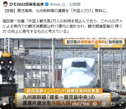 九州新幹線運賃を”外国人だけ”無料にすると書いてるが、“外国人”とは、罪日朝鮮人(帰化人)も対象かな?😅日本人は負担せいってか❓😡日本人に還元しない鹿児島県。所詮、地方自治体も売国奴。ま、日本🇯🇵はDSと朝鮮カルト裏社会に国丸ごと汚染されているからね。😁https://x.com/hide_Q_/status/2026474946285985941
