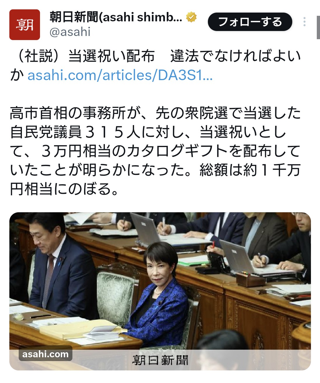 | … | 18無題Name名無し 26/02/27(金)02:04:21 IP:153.164.*(ocn.ne.jp)No.4393506+選挙後の挨拶で感謝の意を示す事は公職選挙法に違反する |