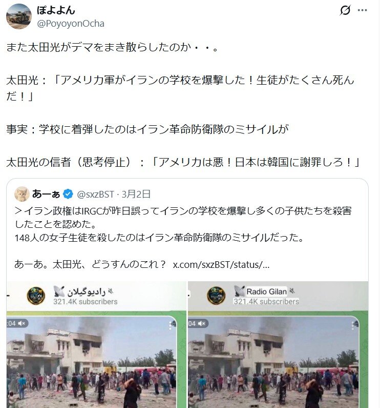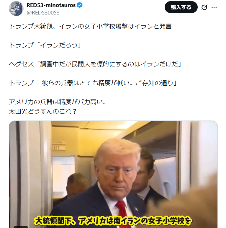 | … | 5無題Name名無し 26/03/14(土)19:00:59 IP:160.237.*(cyberhome.jp)No.4395034+『米軍はピンポイントで軍事施設を攻撃している』 |