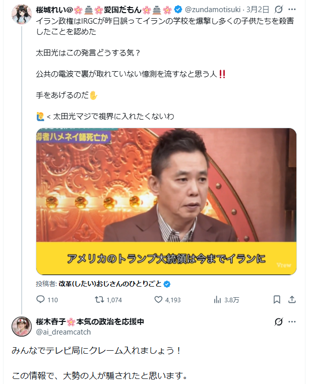 | … | 6無題Name名無し 26/03/14(土)21:02:56 IP:219.107.*(mesh.ad.jp)No.4395041+「報道じゃない、情報バラエティーだ」と言い訳するのなら |
