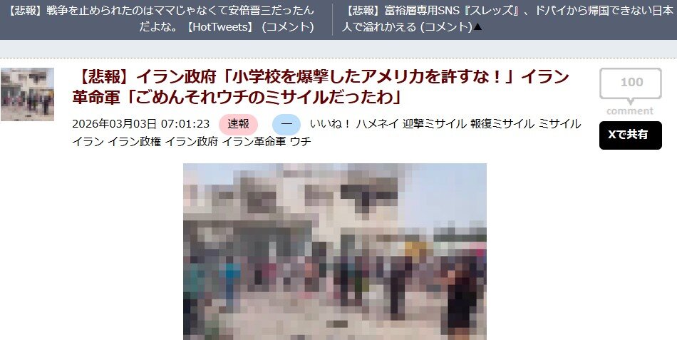 | … | 1無題Name名無し 26/03/14(土)16:45:28 IP:153.191.*(ocn.ne.jp)No.4395012+ 1773474328593.jpg-(114059 B) この問題では、エネルギー輸送の要衝ホルムズ海峡に近いイラン南部ミナブで2月28日、女子小学校が攻撃を受け、イラン当局によると児童や教師ら少なくとも175人が死亡した。その後、ミサイルが着弾する瞬間をとらえた映像から、米国製の巡航ミサイル「トマホーク」による攻撃だったとの見方が濃厚となった。学校は米軍の標的だった軍基地に隣接する場所にあった。 |
