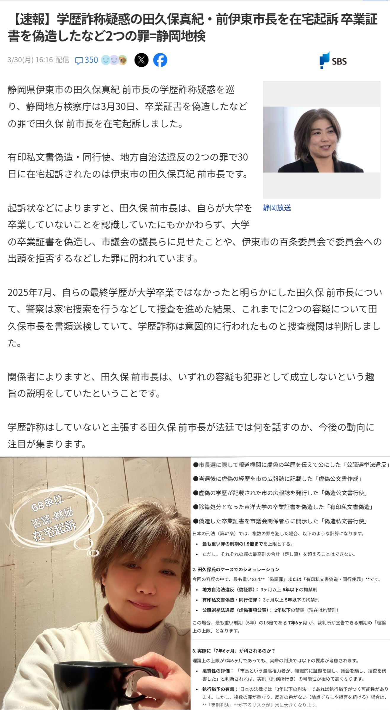 起訴状によると、田久保眞紀はインターネットを介して印鑑製造販売業者から入手した学長と学部長の印鑑を押印し、自分の卒業証書を偽造。6月4日に市役所で示したとされる。