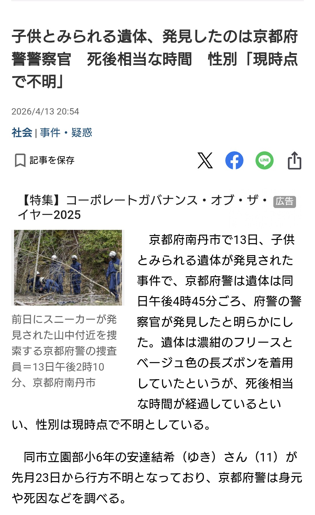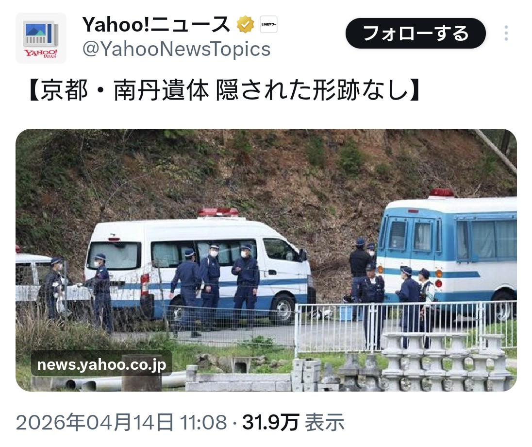 | … | 6無題Name名無し 26/04/13(月)20:00:39 IP:27.91.*(au-net.ne.jp)No.4398058+>京都・南丹周辺で男児の遺体見つかる 京都府警が身元確認急ぐ |