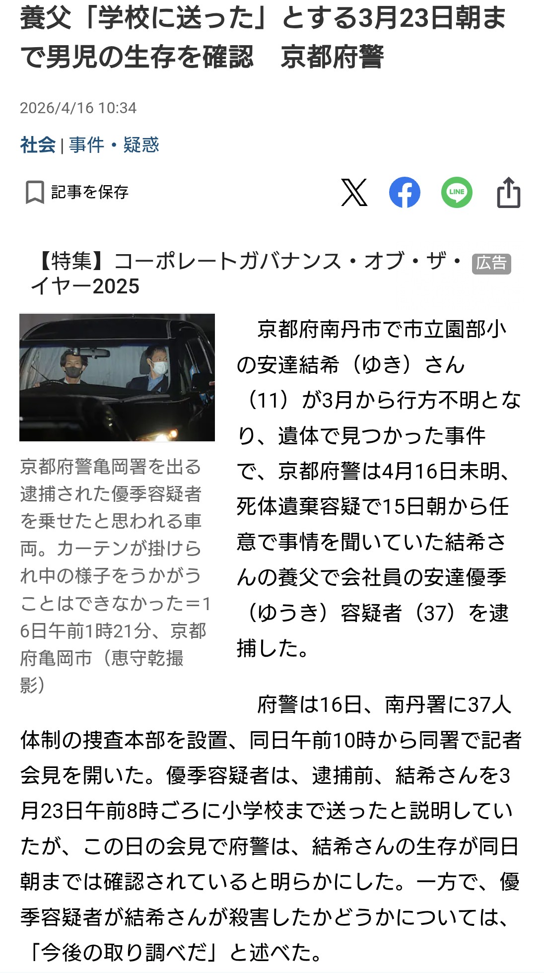京都府南丹市園部町の山林で今月13日に園部小の安達結希(ゆき)さん(11)の遺体が見つかった事件で、京都府警は15日、死体遺棄容疑で、安達さんの父親の30代男性会社員の逮捕状を請求する方針を固めた。捜査関係者への取材で分かった。関与を認める供述をしているという。府警は同日朝から父親に任意で事情を聴き、同町内の父親の自宅を家宅捜索していた。削除された記事が1件あります.見る