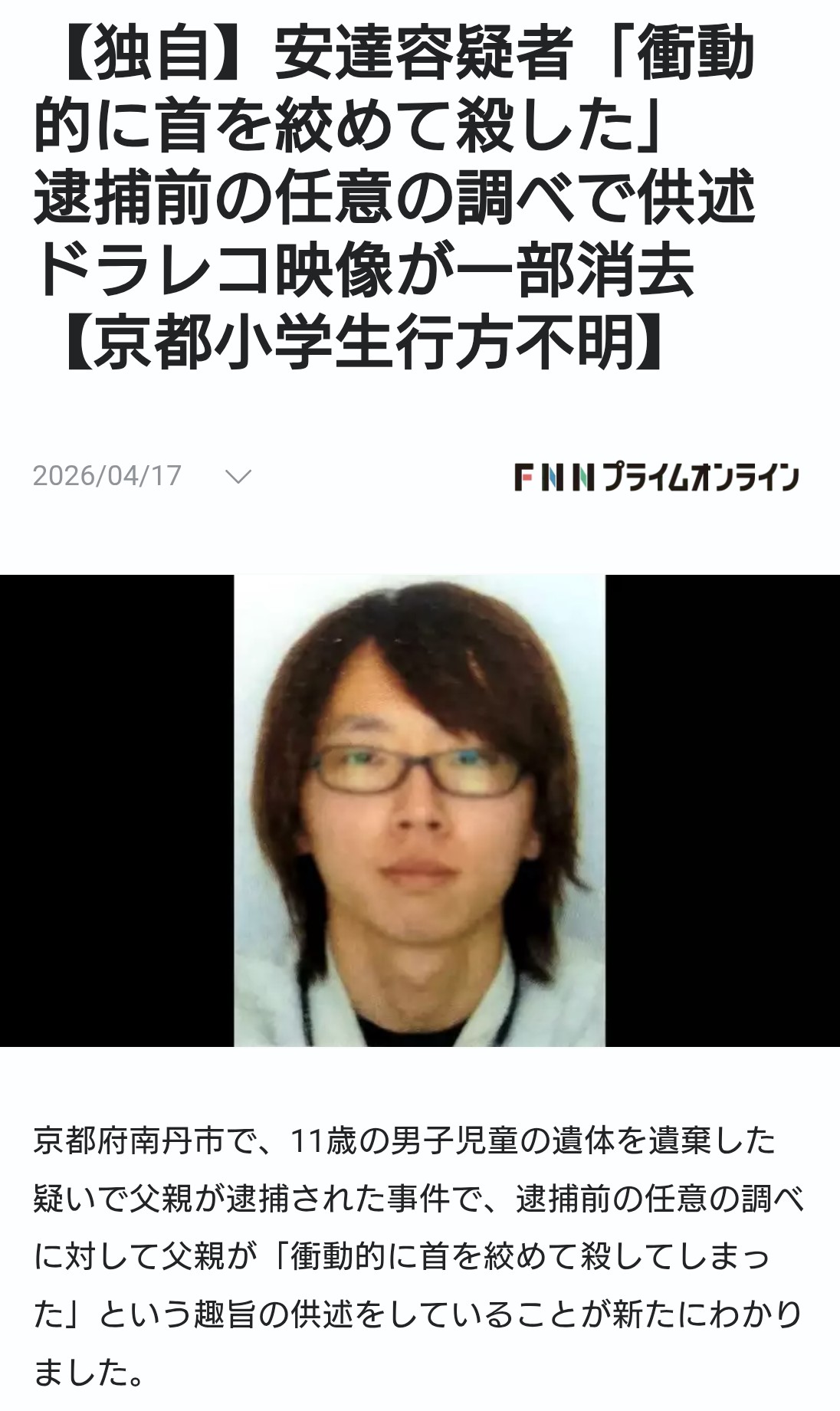 | … | 23無題Name名無し 26/04/16(木)19:52:11 IP:115.36.*(commufa.jp)No.4398365+23日朝までのユキくんの生存を警察はどうやって、何をもって「確認」したんだろうw |